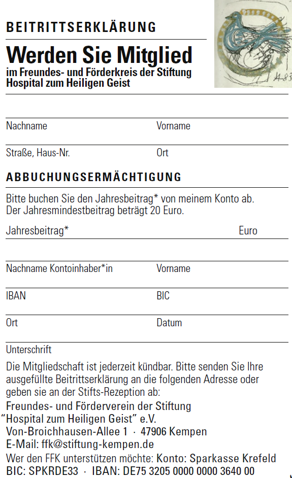 Der Freundes- und Förderkreis der Stiftung „Hospital zum Heiligen Geist“ e.V. – kurz FFK – mit Sitz in Kempen ist der Förderverein der Stiftung. Der 1987 gegründete Verein, der sich aus Spenden und Mitgliedsbeiträgen finanziert, hat es sich zur Aufgabe gemacht, das ehrenamtliche Engagment in den beiden Senioren-Einrichtungen Von-Broichhausen-Stift und St. Peter-Stift zu fördern. Als Verein von Freunden und Förderern der 600 Jahre alten Stiftung Hospital zum Heiligen Geist will der FFK mit seinen rund 270 Mitglieder*innen den Einsatz und die gute Arbeit würdigen, die in den Senioren-Einrichtungen der Stiftung geleistet wird. Der FFK organisiert darüber hinaus kulturelle und informative Veranstaltungen mit dem Ziel, die hohen Güter Gesundheit, Pflege und Betreuung mit caritativem Impetus und würdevoll zu unterstützen.
